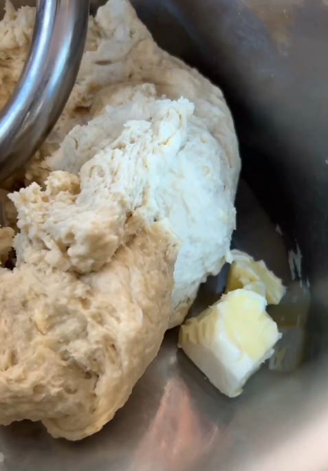 Füge das Mehl, die frische Hefe, Salz, Zucker und ca. 50% der gesamten Milch in eine Schüssel, verrühre alles miteinander und beginne mit dem Kneten. Wenn das Mehl die Flüssigkeit absorbiert hat, darfst du die restliche Milch und die Butter hinzufügen. Knete den Teig für ca. 15-20 Minuten bis er richtig schön geschmeidig ist.