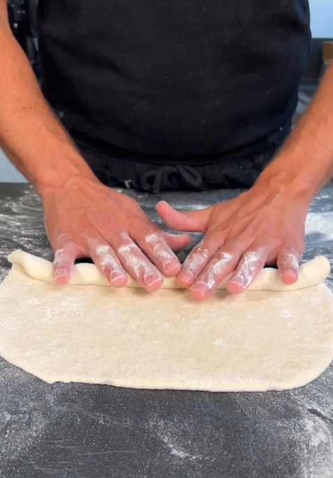 Bestäube deine Arbeitsplatte und den Teigling mit Mehl und beginne ihn mit einem Nudelholz auszurollen. Anschließend mit etwas Zugkraft einrollen. Verschließe das Ende bzw. die Naht mit deinen Fingerspitzen und drücke sie mit deinem Handballen zu.
