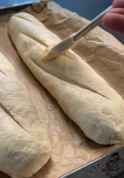 Jetzt dürfen die Stangen nochmal 60 Minuten mit einem feuchten Küchentuch auf einem Backblech reifen. Danach mit einer scharfen Klinge die Subs einschneiden und mit einem geschlagenen Ei bestreichen. Nach Bedarf noch mit Sesam oder einer Parmesan-Oregano Mischung toppen.